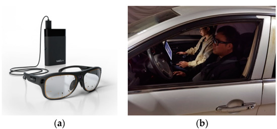 Acquisition of a driver’s pupil diameter data. (a) Eye tracker, (b) the driver wearing eye tracker.