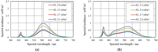 The spectral distribution of LED light sources with different color temperatures is shown in Figure 7. According to the spectral distribution in Figure 7, the spectral irradiance of the LED light sources increased with the increasing brightness in the tunnel. The spectral irradiance distribution reflects the radiation energy of light at different wavelengths. When the electric power of LED lamps was the same, the spectral irradiance of the LED light sources in the tunnel decorated with energy-storage and luminescent coating was greater than that decorated with gray cloth. For the LED light sources, the spectrum presented the bimodal distribution characteristics, and there were obvious differences in the bimodal distribution characteristics of LED light sources with different color temperatures. The spectrum with relatively high peak on the left (about 450 nm, see Figure 7c–e) corresponded to high color temperature, and that on the right (between 540 nm and 590 nm, see Figure 7a,b) corresponded to low color temperature. For the LED light sources with low color temperatures of 2500 K and 3500 K, the blue light component with the wavelength of 430–480 nm was less, while the red and yellow light component with the wavelength of 580–780 nm was more. As the color temperature increased to more than 4500 K, the blue light in the range of 430–480 nm gradually increased and the red and yellow light in the range of 580–780 nm gradually decreased.