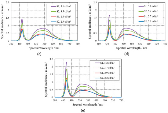 Spectral distribution of LED light sources (S1 and S2 represent sidewalls with energy-storage and luminescent coating and gray cloth, respectively). (a) 2500 K, (b) 3500 K, (c) 4500 K, (d) 5500 K, (e) 6500 K.