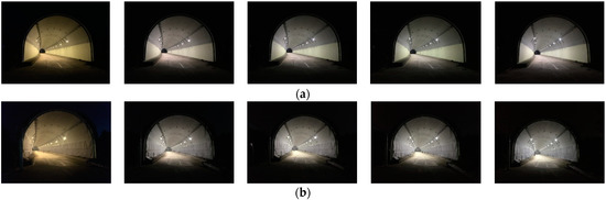 Comparison of lighting environment in tunnel (from left to right: color temperatures of 2500 K to 6500 K). (a) Sidewalls with energy-storage and luminescent coating, (b) sidewalls with gray cloth.