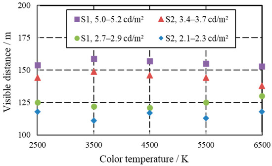 Figure 9 shows the visible distance for a small object with different color temperatures of LED light sources and pavement luminance (the data in the figure is the average value of three observers’ visible distances). As mentioned in Section 3.3, it is beneficial to driving safety if the S/P value of the LED light source increases in the mesopic vision which is between about 0.001 and 3 cd/m2; however, the data in Figure 9 illustrates that the increase in color temperature and S/P value of LED light had no obvious influence on the visible distance of human eyes. Compared with the color temperature and S/P value, the visibility of a small object was more sensitive to the brightness. The visible distance increased to a certain extent after the luminance of the sidewall and road surface in the tunnel improved by the energy-storage and luminescent coating. For the conditions of single lamp power of 10 W and 18 W, the visible distance of the small object increased by 6–10% and 3–10%, respectively.