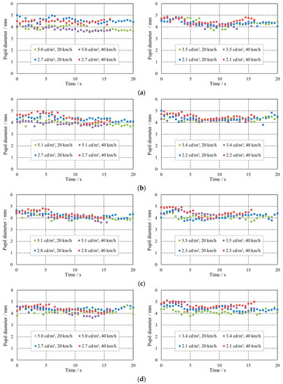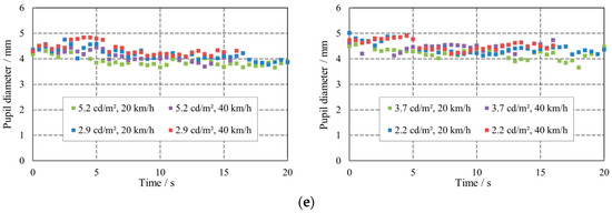 Figure 10 shows the change of the driver’s eye pupil diameter at an interval of 0.5 s while driving in the tunnel with different color temperatures of LED light sources and pavement luminance. The data in Figure 10 shows that for the tunnel with two different sidewalls, the pupil diameter of human eye was basically in the range of 3.8–5.0 mm, and the changing trend was relatively stable when driving in the tunnel at the speed of 20 km/h and 40 km/h. In addition, there was no discomfort for the driver during driving.