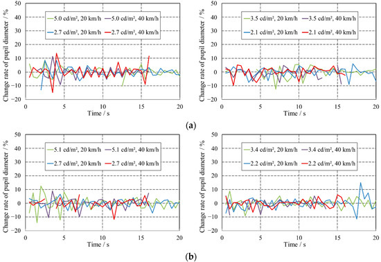 Figure 11 shows the change rate of the driver’s eye pupil diameter at an interval of 0.5 s while driving in the tunnel with different color temperatures of LED light sources and pavement luminance. The data shows that for the tunnel with two different sidewalls, the change rate of pupil diameter in 0.5 s interval was −15–15%. Within the range of this change rate, there was no discomfort for the driver. Combined with the distribution characteristics of tunnel luminance in Section 3.1 and the visible distance of the small object in Section 4.1, it can be seen that for LED light sources with different color temperatures, the pavement luminance increased with the increasing sidewall luminance; this improvement increased the driver’s visible distance to a small object in the tunnel to a certain extent, and had no effect on the driver’s pupil diameter change, which indicates that the increase in tunnel sidewall luminance has a positive effect on the visual performance of drivers.