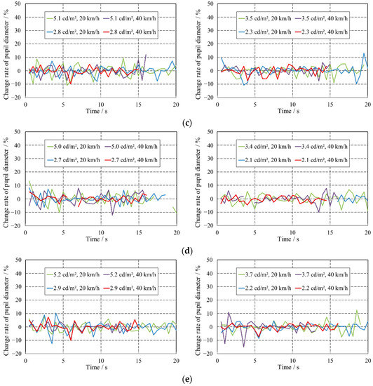 Change rate of driver’s pupil diameter (left: sidewalls with energy-storage and luminescent coating; right: sidewalls with gray cloth). (a) 2500 K, (b) 3500 K, (c) 4500 K, (d) 5500 K, (e) 6500 K.