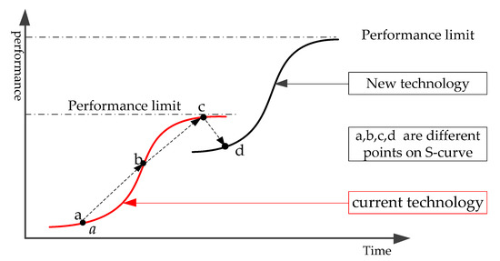 According to the degree of technological change and impact on the market, innovations are traditionally divided into incremental innovation and radical innovation (RI) [26,27]. Incremental innovation is continuous and small changes on the original technological trajectory (S-curve) [28,29] which is the continuous exploration and improvement of the original technological potential. As shown in Figure 1, incremental innovation occurs from point a to b or from point b to c on the same S-curve. Most companies, especially those large and established ones, prefer to engage in incremental innovation because of its low risk. RI is to replace the old technological trajectory with a new one, which can greatly improve the product performance or significantly reduce the cost of the product [30,31]. RI occurs in the replacement phase of S-curve from point c to d as shown in Figure 1. When the performance of current technology has developed to the limit, engineers or designers need to find a new technology to replace the current one [32,33]. The discontinuity of the S-curve is the most obvious technical manifestation of RI [34].