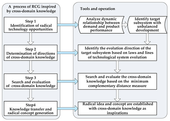 Features of RI related to the technological trajectory and radical performance are the new technical principles inspired by cross-domain knowledge. However, how to accurately and effectively find cross-domain knowledge suitable for the development of radical idea is still a problem. The technological trajectory discontinuity of RI makes it difficult for engineers to predict the next-generation technology and obtain cross-domain knowledge for RCG. And RI has high requirements on firms’ knowledge reserves [38], strategic positioning [39], absorptive capacity [21,22] and other aspects. It is difficult for firms to find appropriate cross-domain knowledge to form radical concepts and ideas with low cost and risk, especially small and medium-sized ones [40]. Therefore, it is essential to have an operable process for RCG to improve the success rate of RIs.