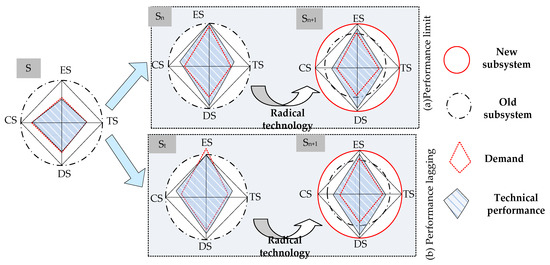 Performance limit situation: In the initial state S of the technical system, the performance of all subsystems meets customer needs. Driven by market pull and technology push, technical system goes from state S to state Sn through incremental development. In the state Sn, ES has developed to the performance limit, but CS-DS-TS have not reached the performance limit. The technical performance of all the subsystems in the state Sn is still able to meet the customer needs, or even in a state of performance ahead of the demands. However, in order to meet the rapid growth of user needs, establish technical advantages, create exciting needs of users, and form technical barriers to other firms and other factors, it is necessary for firms to carry out a new technology to replace the old one in ES. In other words, it is an opportunity for firms to develop radical technology. Through the application of new technologies, ES moves from state Sn to a new state Sn+1, the technical performance of ES will be greatly improved, as shown in Figure 3a.