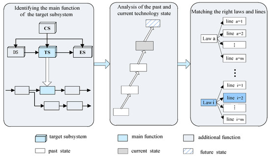 Through the analysis of radical technology opportunities above, we can identify the target subsystem that needs radical technology to improve the performance. In order to accurately find cross-domain knowledge for RCG, we need to determine the search direction of cross-domain knowledge first. In this part, a comprehensive process to identify the search direction of cross-domain knowledge under the guidance of laws and lines of evolution is produced. In the process, the technological trajectory and radical performance of RI are considered. The overall flow of the approach includes the following four steps as shown in Figure 4.