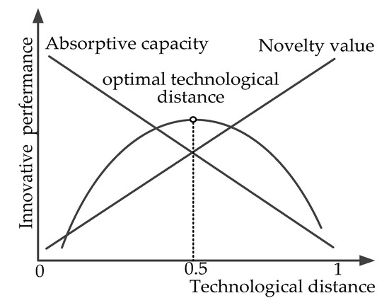 - Appropriate cross-domain knowledge. Technological distance affects both knowledge acquisition and innovation performance, but there are two opposing mechanisms at work, as described in the first paragraph of 2.3 [72]. That is why the relationship between technological distance and innovation performance is an inverted U-shaped curve, as illustrated in Figure 5.