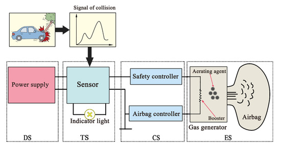 The power (DS) supply provides the driving force for the airbag system, the sensor (TS) is responsible for compiling and transmitting signal, the safety controller and airbag controller (CS) recognize the signal from the sensor and determine whether to activate the air bag, the gas generator and air bag (ES) form a protection system.