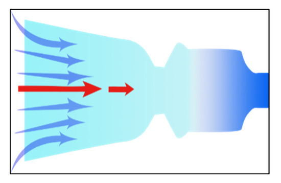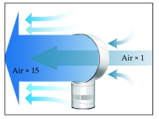 - Analysis of related patents. Analyze the main technology and principles used in related patents of the firms No.1 and No.10. No.1 is an internal combustion engine manufacturing firm that uses the “Conda Effect” to improve the design of the combustion chamber to increase the intake efficiency of the internal combustion engine. The red arrow shows a small amount of compressed air, and the blue arrows are the ambient air that is being sucked, as shown in Figure 10. No.10 also utilizes the “Conda Effect” to develop air-multiplier product such as bladeless fan, as shown in Figure 11. The high-speed airflow flows in from the base of the bladeless fan, and then it flows out from the narrow gap reserved by the top ring structure. The low pressure created by the high-speed airflow will drive a large amount of surrounding air through the ring, making people feel cooler.