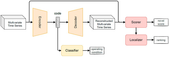 In this paper, we propose to extend a generic AE model in order to make an effective implementation of the architecture template for finding novel operating conditions that satisfy all desiderata. An AE is composed of an encoding and a decoding network. The encoder maps the original data onto a low-dimensional feature space, while the decoder attempts to recover the data from the projected low-dimensional space. The parameters of these two networks are automatically learned, without any user intervention, through a reconstruction loss function. The main extensions we propose are shown in Figure 1 and consist of a Scorer that analyzes the reconstruction error (the error made by the decoder component in reconstructing the multivariate time series provided as an input); a Classifier that exploits the low-dimensional encoding of the input to recognize the actual operating condition; and a Localizer that recognizes the signal mainly supporting the inference of the novel condition, thus explaining the model behavior. A scaler is inserted at the beginning of the pipeline to normalize the input signals and evaluate their contribution without the biases that would result from different range values.