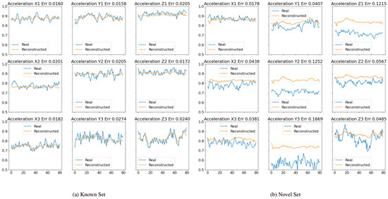 The Localizer relies on the reconstruction error to compute the signals that mainly contributed to the inference. This component computes the error on the raw input signals, and not on the transformed version as for the Scorer. In this way, the impact of the normalization processes introduced by the data transformer component and the AE network is reduced and the error computation is more reliable. Figure 2a,b show the reconstruction of the input signals performed by the localizer. The plots refer to a CNN-based AE, trained on the signals from the operating conditions C1, C2, and C4 and aimed at identifying the condition C3 as a new condition. Figure 2a refers to the reconstruction of the input signals of a time series of status C2 (composed of 9 input signals), which are part of the series used for the training. Figure 2b shows the original and reconstructed signals on C3. The number on the top of each plot is the mean reconstruction error. Figure 2a shows that the model can learn the input signals, and the error is generally low. Figure 2b shows that the reconstructed signals are not able to infer the actual signal. In particular, the higher error is measured on Y3, which represents one of the main reasons for the prediction of C3 as a novel state.