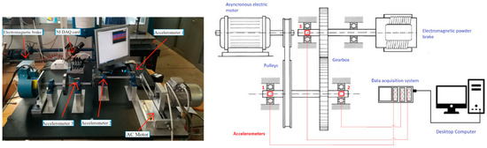 The platform used for the creation of the first dataset is composed of an asynchronous motor, a gearbox made of two pulleys that exchange the rotation through a belt, two shafts that share the motion thanks to a couple of gears, and an electromagnetic brake. The platform and its mechanical scheme are depicted in Figure 3. The platform is provided with three triaxial accelerometers, which are placed on the bearing’s support, next to the second pulley and the two gearboxes, respectively. They have a sampling frequency of 12.8 kHz per axis and an acceleration range of 500 Gpeak. A complete description of the platform can be found in [11]. For the purposes of experimentation, tests in four distinct operating conditions and a fault condition were conducted. The rotational speed is fixed at 660 rpm, while the distance between the pulley and the braking torque varies. The parameters and the duration of each condition are shown in Table 1. Note that each batch has a length of 10 min. A representation of the raw signals in the four operating conditions is provided in Figure 4. The considered signals represent a multi-variate series where each feature is an acceleration. As can be seen, while the accelerations in the first operating condition are rather stable, significant oscillations occur in the other conditions, but only state C4 describes an anomalous operation of the machinery (i.e., states C1–C3 represent normal operating conditions). The anomalies in state C4 are caused by the unforeseen overheating of the electric motor, which led to the sudden shutdown of the system.