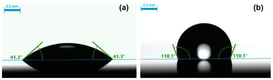 Figure 1a is an optical image of a water droplet placed on a bare SiO2 substrate ultrasonically cleaned in methanol for 15 min, showing a CA of 41°. Depending on the cleanness of the surface, CAs of 40–50° were commonly observed. This level of water CAs indicates that organic contaminants are still present on the solvent-cleaned substrate because water should spread on the surface of a SiO2 substrate that is free from contamination. In fact, there is always a layer of hydrocarbons absorbed on almost any type of surface, which are referred to as adventitious hydrocarbons [,,]. We confirmed that for a SiO2 substrate subjected to a UV/ozone treatment for 30–40 min, water completely spread on the surface; that is, no contact angle was measurable. This is a proof that organic contaminants, including adventitious hydrocarbons, were largely removed from the substrate, rendering the surface dominated by hydroxy groups. This surface-cleaning procedure (or other wet etching ones [,]) is required to achieve high-quality organosilane SAMs on oxides.