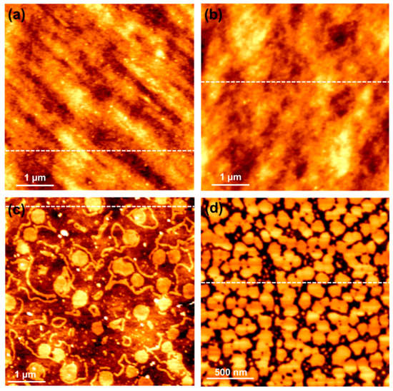 AFM topographic images for a bare SiO2 substrate (a); OTMS SAMs with complete coverage prepared on a UV/ozone-treated SiO2 substrate (b); OTMS SAMs with partial coverage formed on a UV/ozone-treated SiO2 substrate (c); a freshly cleaved mica substrate (d). The broken line shown in each image indicates where a profile is isolated (and shown in Figure 3). The scan areas for (a–d) are 5 µm × 5 µm and 2 µm × 2 µm, respectively. The heights for (a–d) are 2.88, 3.02, 18.41 and 2.07 nm, respectively.