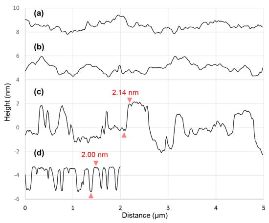 In order to understand the surface morphology of the OTMS SAMs formed on the SiO2 substrate, AFM was used to study the SiO2 substrate and the OTMS SAMs formed on said substrate. Figure 2 shows four AFM topographic images in false color scales; that is, brighter colors represent greater height values. The scan area for AFM images in Figure 2a–c is 5 µm × 5 µm, while that for Figure 2d is 2 µm × 2 µm. The broken lines inserted in the images indicate a scan line to be isolated to show a profile for each image, which are shown in Figure 3. Figure 2a shows the surface morphology for the bare SiO2 substrate. When the surface of the SiO2 substrate is derivatized by OTMS SAMs, as shown in Figure 2b, there are no significant differences in morphology between the two samples. This is a reflection that the surface is completely covered by a monolayer of OTMS so that the morphology of the underlying SiO2 substrate is replicated. This result was confirmed on OTMS SAMs formed on multiple SiO2 substrates. The average surface roughness values for the images in Figure 2a,b were 0.29 and 0.37 nm, respectively. This difference in roughness is likely due to the inhomogeneity of the morphology of the SiO2 substrate captured in a scan area of 5 µm × 5 µm.