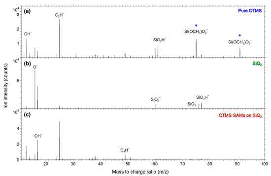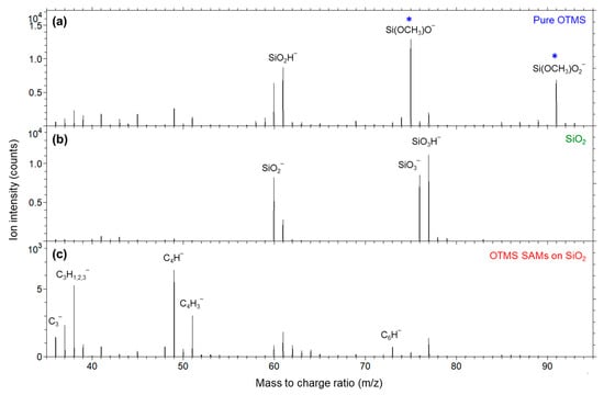 The m/z range of 11–100 was selected to illustrate the distribution of intensities of ions relative to that of the most abundant ion of C2H− (25) in Figure 4a,c as well as O− (16) in Figure 4b. The dominant C2H‾ is due to the methylene chains of the OTMS molecules, whether they are free molecules (Figure 4a) or in their SAMs (Figure 4c). For the same reason, the intensity of CH− (13) is also relatively strong. By contrast, as shown in Figure 4b, the SiO2 substrate is dominated by O− and silicon oxide ions, such as SiO2− (60), SiO3− (76) and SiO3H− (77). The rather weak C2H− and CH− signals detected on the SiO2 substrate are due to the ubiquitous adventitious hydrocarbons, which exist on almost any surface [,,]. Because the higher m/z ions in Figure 4c are much weaker than C2H− and their comparison with those in Figure 4a,b will lead to insight into the interface chemistry of the SAMs, the spectra of the three samples are replotted in m/z range 35–95 in Figure 5 to analyze these ions among the three samples.