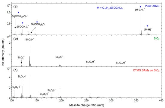 On the other hand, it is interesting to note that the OTMS SAMs on a SiO2 substrate (Figure 6c) show other silicon oxide ions that are rather weak from the bare SiO2 substrate (Figure 6b), which are Si2O4H−, Si3O5H− (165) and Si3O6H− (181). Therefore, it is plausible that these are mainly, if not solely, associated with the –Si–O–Si– network resulting from the polymerization of the silanols generated from the hydrolyzation of the methoxy groups of the OTMS molecules.