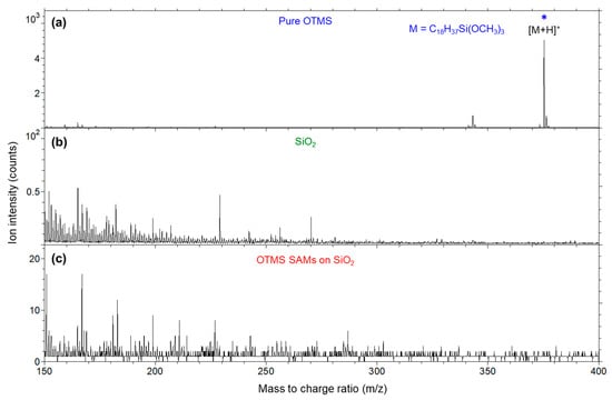 On the other hand, applications of ToF-SIMS in studying organosilane SAMs on oxides are mainly used to study the surface chemistry of SAMs []. ToF-SIMS studies focused on the interface chemistry of organosilane SAMs on oxides are rather scarce []. In this article, the usefulness of ToF-SIMS in probing the interface chemistry of octadecyltrimethoxysilane (OTMS) SAMs formed on a SiO2 substrate is demonstrated via comparisons of ion fragmentation patterns of free organosilane molecules, their SAMs on a SiO2 substrate and the substrate itself. Our ToF-SIMS analyses aim at providing unique information on understanding the interface chemistry of OTMS SAMs.
