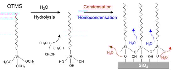Shown in Figure 9 is an illustration of (1) an OTMS molecule, (2) the conversion of its three methoxy groups to three hydroxyl groups and the release of three methanol molecules via hydrolysis, and (3) the condensation reaction between silanols (Si–OH) and the hydroxyl groups of the SiO2 substrate to anchor the molecules to the substrate, as well as the homocondensation reaction [,] between silanols to polymerize the molecules to form the –Si–O–Si– network. The condensation and homocondensation reactions result in the formation of water molecules, which evaporate. The closely packed methylene chains terminated with the methyl groups of the OTMS SAMs provide hydrophobicity, which is responsible for the large water CAs observed (Figure 1b).