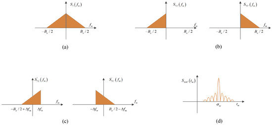 The principle of the SAC algorithm is shown in Figure 3. It can be seen that the SAC algorithm can estimate the value of without iteration. The Doppler spectrum of the signal is divided into left and right sub-bands, and then the cross-correlation function after sub-band translation is obtained. The cross-correlation peak position can be used to estimate the Doppler modulation frequency. The spectrum of is divided into left and right parts. The left and right spectra obtained by shifting and , respectively, can be expressed as [26]