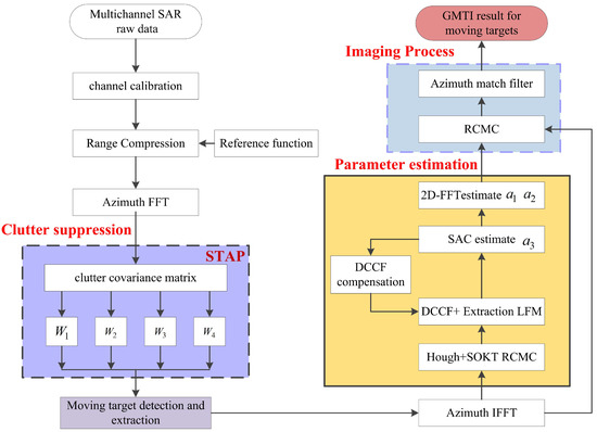 In this paper, focus imaging is performed on the raw data. So, clutter suppression, target detection and target signal extraction are necessary before refocusing the moving target. After clutter suppression and target detection, the background is sufficiently uncluttered. The proposed method can be summed up five steps. Step I: Clutter suppression and target detection based on multi-channel and target signal extraction. Step II: The RCMC is realized by Hough transform and SOKT. Step III: Constructing DCCF to reduce the third-order phase in the slow-time domain to second-order; then the parameter estimation is converted into peak detection with the SAC algorithm and 2D-FFT, which simplify the parameter estimation process. Step IV: The moving-target focusing imaging is performed by the estimated third-order phase coefficient. Finally, based on the estimated parameters, the target is relocated.
