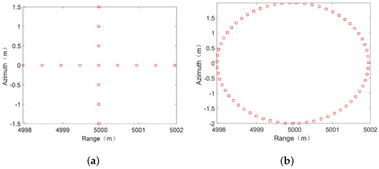 In high-resolution SAR images, the target is often composed of multiple pixels. In order to verify the ability of the algorithm to maintain the target geometry, this paper carried out the simulation analysis of moving targets with “cross” distribution (hereinafter referred to as T1) and “circular” distribution (hereinafter referred to as T2). T1 consists of 15 strong scattering points. The azimuth and range intervals between the scattering points are both 0.5 m, and the coordinate distribution is shown in Figure 6a, where the red squares represent the positions of the scattering points. T2 is composed of 63 scattering points uniformly distributed on the circumference, and its coordinate distribution is shown in Figure 6b. In Figure 6, the abscissa is the slant range, and the ordinate is the azimuth coordinate.