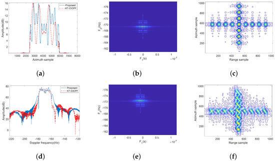 In addition, the focusing performance of the moving target is shown in Table 6. The theoretical range resolution is m. According to the system parameters, the Doppler bandwidth in the synthetic aperture time is about 300 Hz. So, the theoretical azimuth resolution is m. As can be seen from the table, the resolution obtained by the proposed method is closer to the theoretical value than that obtained by the KT-CICPF method. The azimuth resolution of the KT-CICPF method has a greater broadening. It is proved that the proposed method has better focusing performance.
