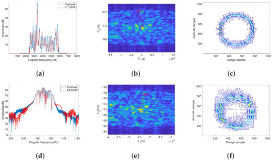 Two methods are used to process it. Figure 7 and Figure 8 show the processing results of T1 and T2, respectively. Figure 7a,d and Figure 8a,d are the amplitude and spectrum of the chirp signal corresponding to the DCCF peak range cell, which are used to estimate the coefficient of the third-order term. The signal gain and resolution extracted in the proposed method are higher than those extracted by KT-CICPF. Figure 8b,e are the – parameter planes constructed by the two methods for the target T2, respectively. From the figures, it can be seen that the peak in the – plane constructed by the proposed method is relatively concentrated and the coupling degree with range migration is small. The peak of the – plane constructed by the KT-CICPF is divergent. The reason for this phenomenon is that the residual range migration by the KT-CICPF method is larger, resulting in a large parameter estimation error. For the target T1, Figure 8b,e illustrates the same phenomenon. In this paper, when constructing the – plane, Equation (29) is used to compensate for the DCCF to reduce the influence of the third-order range migration on the – parameter plane. Figure 7c,f and Figure 8c,f show refocused results of the two methods. It can be seen that the imaging results of KT-CICPF methods are severely defocused in azimuth. The proposed method can better maintain the shape of the target.
