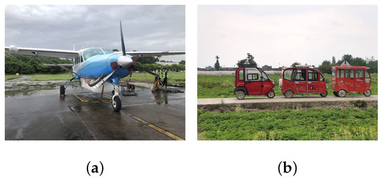 In this paper, the real data collected by a four-channel airborne X-band SAR system are used to verify the performance of the proposed method. The system parameters are shown in Table 5. The four channels are equally spaced in the azimuth direction, and the working mode of one-transmitter and four-receiver is adopted. In this paper, the target signal extracted after clutter suppression is imaged. The flight platform and cooperation targets are shown in Figure 9a,b, respectively. There are three electric tricycles as cooperative targets in the experiment. Each target is equipped with a corner reflector, and a GPS device is installed to record the real-time position and speed information of the target as the true value of the target movement.