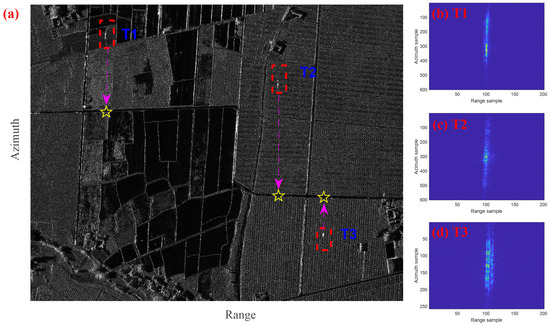 The imaging result of the stationary scene without processing of GMT is shown in Figure 10a. The magnified images of T1–T3 are shown in Figure 10b–d, respectively. As can be seen from the figure, targets moving along the radial direction are defocused and appear displaced in azimuth from their original position.