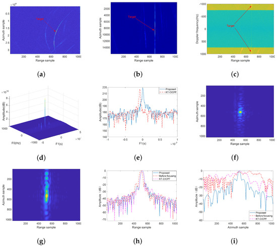 Processing result of T1. (a) Target signal after clutter suppression. (b) Hough+SOKT RCMC; (c) Range-Doppler domain. (d) – parametric plane. (e) estimate. (f) Imaging by proposed method (16× upsampling). (g) Imaging by KT-CICPF (16× upsampling). (h) Slice in range. (i) Slice in azimuth.