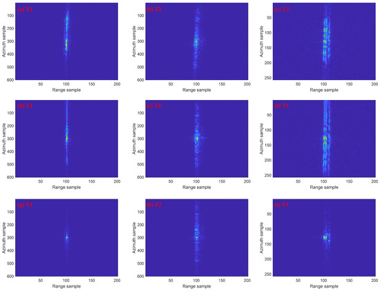 To verify the adaptability of the algorithm, the same processing is used for T2 and T3 as for T1. Figure 12 shows the refocused results of the three targets by three methods. The magnified images of moving targets without processing of GMT are shown in Figure 12a–c, respectively. The refocused results by the KT-CICPF method of T1–T3 are shown in Figure 12d–f. The results by the proposed method are given in Figure 12g–i. As can be seen from the figure, the focusing effect of the proposed method on T1–T3 is superior to that of KT-CICPF method.