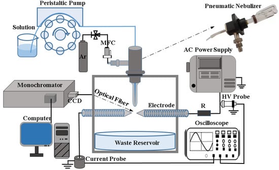 The diagram of the experimental setup for detecting the Cu element is illustrated in Figure 1 schematically, which is composed of a nebulization plasma reactor, an AC power supply, an optical detection system and an electrical measurement system. For the nebulization plasma reactor, the aerosol is generated by pneumatic nebulizer (Beijing Puxi, WNA-II). The solution containing the Cu element is pumped into the pneumatic nebulizer by the peristaltic pump (Chongqing Jieheng, BT-50EA/153Yx) with a solution flow rate of 2 mL/min, and argon (99.999%) controlled by a mass flow controller (Beijing Huibolong, D07-7K) with a range of 0–20 L/min, employed as the working gas in the experiment. In addition, high-purity tungsten rods (≥99.99%) are used as high-voltage electrode and ground electrode with 4 mm diameter, 70 mm length, and 45° cone angle of tip. The discharge gap is kept at 2 mm, and the aerosol is sprayed on the discharge gap. Under the excitation of AC power supply, gas breakdown occurs between the two electrodes and APNDP is generated. To collect the waste solution treated by APNDP, a culture dish is placed under the plasma reactor as a container for recycling waste liquid.