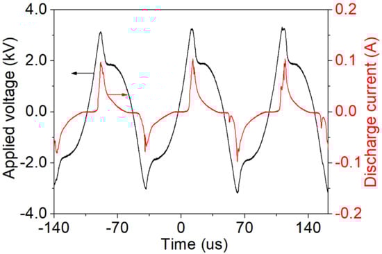 Waveforms of applied voltage and discharge current. (Ar flow rate: 2.1 L/min, discharge gap: 2 mm, applied voltage: 6.2 kV).