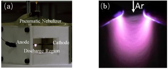 (a) Nebulization plasma reactor; (b) image of nebulized discharge. (Ar flow rate: 1.68 L/min, discharge gap: 2 mm, applied voltage: 5.6 kV).
