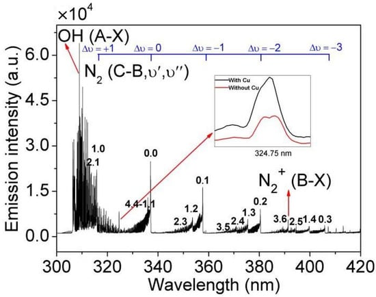 The OES in the range of 300–420 nm containing 1 mg/L Cu2+ is shown in Figure 4, which is mainly composed of the atomic spectral lines of Cu I (3d104p-3d104s, 324.75 nm), the bands of OH (A2∑-X2∏) and N2 (C3∏u-B3∏g). Under the action of the high-temperature and high-energy plasma, the atoms and molecules of the discharge region are collided, excited, and ionized to generate excited atoms, excited molecules, and free radicals, etc., and, eventually, OES is generated [24].