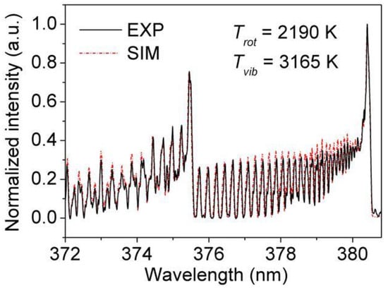 Using “Specair”, when the rotational and vibration temperature are inputted, a simulated spectrum of N2 (C3∏u-B3∏g, Δυ = −2) is calculated. Then, the simulated spectrum is compared repeatedly with the experiment until the most fitting one is found, as shown in Figure 5. The result is obtained under the conditions of 5.6 kV applied voltage, 1.68 L/min Ar flow rate, pH = 3.59 and 2% (V/V) ethanol. It is clearly shown that the gas temperature is about 2190 K, and the vibrational temperature of N2 (C3∏u) can also be acquired, which is about 3165 K. In the nebulized discharge, it is obvious that a very high gas temperature is obtained, which can promote the processes of reaction (1–4), thus obtaining a higher emission intensity [28].