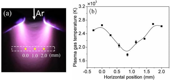 (a) Measurement area of plasma gas temperature; (b) the distribution of plasma gas temperature with horizontal position (Ar flow rate: 1.68 L/min, discharge gap: 2 mm, applied voltage: 5.6 kV).