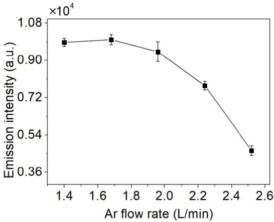 The effect of the Ar flow rate on emission intensity (applied voltage: 5.6 kV, no organic matter and nitric acid, solution flow rate: 2 mL/min).