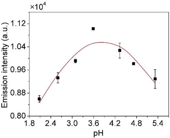 The pH also has a significant influence on the Cu I (3d104p-3d104s, 324.75 nm) emission intensity, affecting the chemical characteristic because it changes the liquid ingredient [31]. The result is obtained under the conditions of 5.6 kV applied voltage, 1.68 L/min Ar flow rate, and no organic matter added, as shown in Figure 9. The emission intensity increases with the pH value from 2.08 to 3.59 and reaches the maximum value, and when the pH value is higher than 3.59, the emission intensity gradually decreases. The result indicates that Cu ions are more favorably converted to their volatile species in a weak acidic condition, promoting the progress of reaction (2), so the emission intensity is increased [16]. Cu ions are largely unstable at near neutral pH, resulting in an enhanced hydrolysis of metal ions, so the emission intensity is reduced [23]. Therefore, 3.59 pH with HNO3 is selected to improve the sensitivity of detection and the atomization efficiency of copper.
