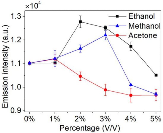 It is observed that the presence of specific organics greatly enhances the signal intensity of Cu I (3d104p-3d104s, 324.75 nm), because it changes the chemical characteristics [32]. The result is obtained under the conditions of 5.6 kV applied voltage, 1.68 L/min Ar flow rate, and pH = 3.59. As shown in Figure 10, with the increase in organics concentration, the emission intensity of copper increases initially and then decreases. A small amount of specific organics can reduce the surface activation energy of positive Cu ions and promote the progress of reaction (1) [33], and can accelerate decomposition of the sample solution to produce H radicals and promote the progress of reaction (2) [34], so the emission intensity is increased. When excess organic matter molecules enter the discharge region, the average energy used for molecular decomposition is decreased under the condition of constant applied voltage, resulting in a decrease in the number of dissociated organic molecules and active free radicals, so the emission intensity is reduced. In addition, different organic compounds have different effects, among which 2% (V/V) ethanol promotes copper atomization the most.