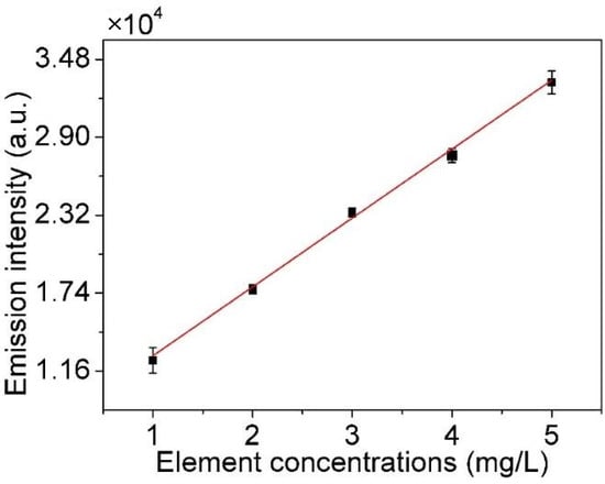 The solution with a series of concentrations of metal element (Cu2+ of 1, 2, 3, 4, 5 mg/L) and the blank solution are used to determine the working curve of Cu, as shown in Figure 11. The LOD is calculated by the following equation.