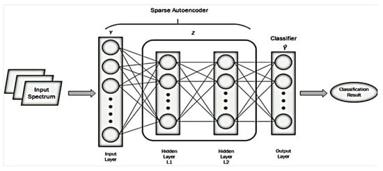 Copying an input to its output is not an effective and desired task, as it only memorizes what it has seen. This memorization may lead to over fitting, resulting in poor generalization. A variant of AE exists with more generalization power, namely, sparse auto-encoder (SAE) [42]. It copies the input data, attempts to learn the real underlying data distribution, and performs accurately on the test data. SAE focuses on learning the data distribution by restricting the number of connections in the hidden layer [39,40]. An AE architecture consists of an input layer, an output layer, and a single hidden layer responsible for the encoding function of the input data, as shown in Figure 6. An under complete AE has a smaller number of neurons in the hidden layer than the input layer. The number of encoding neurons in each hidden layer is equal, but they fire their decision using the sparsity elements, making the architecture of SAE unique, as shown in Figure 7. SAE has the choice to activate neurons of the network within each hidden layer selectively, thereby introducing sparsity in the connections between each layer [43]. Compared to the simple AE version, SAE constraints the network’s capacity to memorize the input data without limiting its capability to learn the underlying representation of the input data. In SAE, loss reduction is based on using the mean-squared-error (MSE) along with the sparsity conditions. To impose these conditions, the loss function of SAE is given by Equation (3):