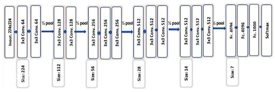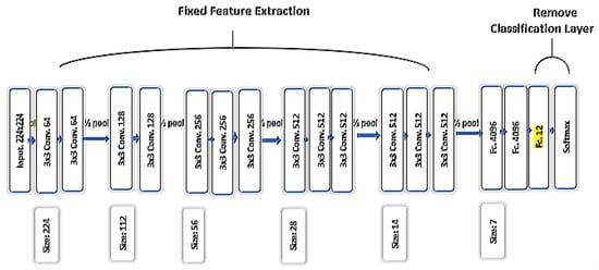 In the proposed work, transfer learning is employed to extract the final features using a recent variant of CNN architecture, namely, VGG-16 [31]. Figure 9 shows the architecture of VGG-16, which consists of sixteen layers, including convolutional pooling layers, fully connected layers, followed by the output layer. In the proposed technique, a pre-trained model on ImageNet [45] is used, which consists of one thousand classes of images with one million images per class. It saves us from the difficulty to train VGG-16 from scratch. The fully connected layer is discarded to extract all features directly from the convolutional feature maps’ activation before the last layer. This step feeds a three-dimensional matrix (224 × 224 × 3) and computes a 4096-D vector on each image. An important step is to apply an activation function. We used one of the most powerful differential functions, namely, the rectified linear unit (ReLU), which thresholds the values at zero. The need to do this step because each layer’s activation is also a threshold during the training of the network on ImageNet.