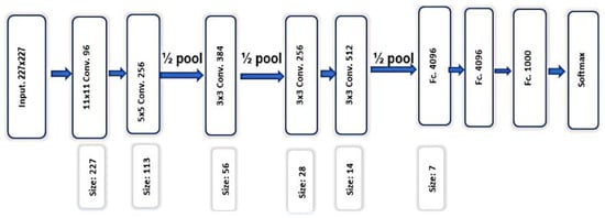 Another successful variant of CNN is Alex-Net [44], which is an eight-layer deep architecture, as shown in Figure 10. It is most widely used to perform feature extraction in computer vision-related applications. In this work, the exploitation and identification of the proposed methodology’s learning ability and competence are carried out. The mechanism behind the feature extraction using Alex-Net is the same as mentioned for VGG-16. By using multiple deep learning models, this research highlights the generalization and flexibility of the proposed reverse image search system, i.e., we do not constrain the model. An important concept in the deep learning technique is to adopt already trained models for improving performance-related tasks, usually referred to as transferring knowledge of similar models, known as Transfer Learning (TL).