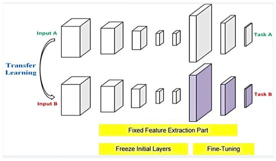 It produces noteworthy results when the source and target tasks are interconnected; otherwise, the target task’s performance may not be promising. This concept is useful for training deep learning architectures because they consume more computational time during their training [44,46]. Figure 11 shows the concept of TL that saves us from the difficulty of training a model from scratch by using an already designed method that has been trained on a similar data distribution. Thus, TL greatly reduces the cost of designing similar models and pays the cost to get new training data each time by using the knowledge learned in one model on a similar dataset for other related tasks. It is specifically desirable to deal with a smaller number of training instances. Generally, the researchers use the pre-trained original deep neural network on their customized dataset. After that, fine-tuning of the learned features is done for another dataset with a new target network, as shown in Figure 12. For example, a model trained for different dog classes can also be used to classify cats by performing fine- tuning. TL is employed in the second phase in the proposed work by using a pre-trained deep discriminative model, which is trained on similar and larger image domains. It results in an improvement in generalization. There exist different scenarios, which describe the use of Transfer Learning, categorized as follows in the sub-section: