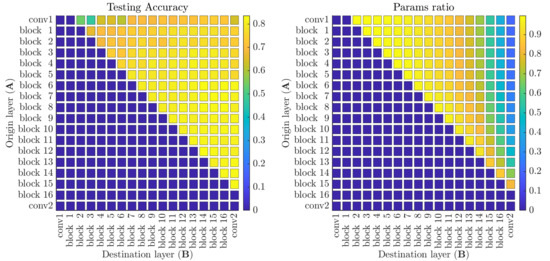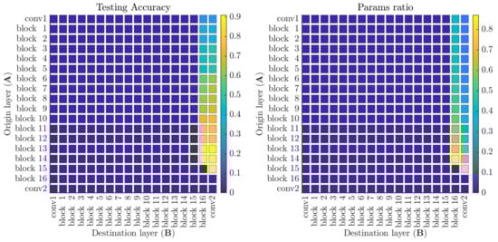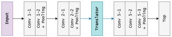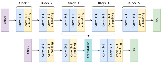 In Figure 4, there is an example of a VGG16 [36] pruned architecture, where it can be observed that blocks 3 and 4 are deleted, then the last layer from block 2 and the first layer from block 5 are used for the re-connection with the translator block.