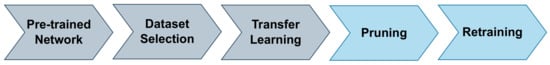 The network pruning methods are designed to remove those unimportant connections that generate redundancy and can be removed without drastically affecting the network performance [25]. Nevertheless, most of these compression techniques establish an iterative process of pruning and retraining as the strategy to compensate for the accuracy loss. Therefore, the pruning process often requires extensive retraining periods, and the compression has to be applied gradually to avoid a drastic impact on the performance.